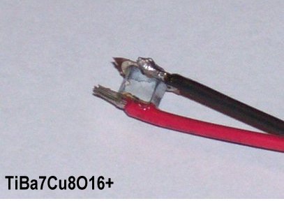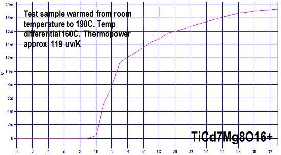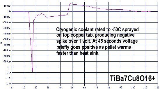 Direct thermal tests of TiBa7Cu8O16+ showed a very strong Seebeck voltage. In the above left plot over one volt appears as the material is cooled from room temperature to -50C. The fact that -50C is below the superconductive transition temperature (0 C) of the minority phase, may help explain the amplitude of the voltage surge. The Seebeck Effect and low-VF Cooper-pairing may be complementary phenomena. The nominal Seebeck voltage of this same material is only 2.5% as strong as the surge voltage. That much of a thermopower difference can only be explained by the superconductivity component that exists below 0 C. To read more about this, CLICK HERE.
