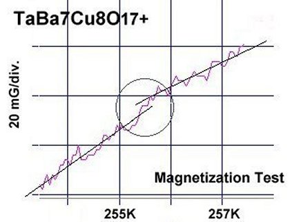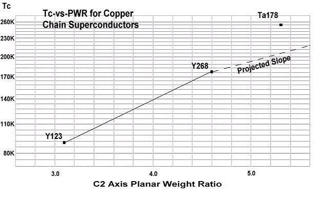 The above right graph shows how Tc should increase with higher planar weight ratios along the C2 (TaBa) axis. The projected slope was derived from the graphs of several dozen other high-temperature superconductors that were created through the application of planar weight disparity. The position of Ta178 on the graph is almost 50 degrees Kelvin higher than it should be. This is probably due to the high dielectric constant of TaCuO.