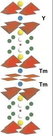 ![]() The structure of this material (shown at left) is a 3212/3223 intergrowth. Although the Tm and Y atoms are interchangable between atomic sites, it is believed that the TmTm-Y structure is responsible for Tc >100K. This arrangement produces the highest planar weight ratio (4.5) and extrapolates to a theoretical Tc of 108K. The 1212/1223 analog of this mix failed to superconduct above 77K. |