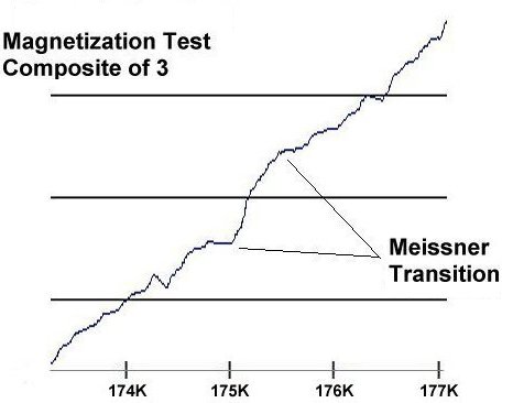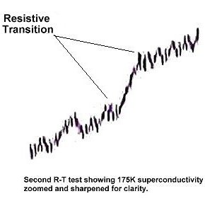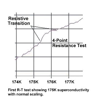 Very high planar weight ratios are not attainable by stoichiometric synthesis. They occur only as byproducts. So, a means needed to be derived wherein a minority phase of 1245/1212 material would occur in amounts large enough to measure within the bulk of a parent compound. Success was finally realized by increasing the amount of Tm and Cu by 5% in a 1223/1212 host. And, by increasing the ratio of Sn to In from 5:5 to 7:3. Four separate tests of the resulting material showed sharp resistive transitions near 175K, 174K 176K and 177K for the minority phase. Three of those plots are shown below and the fourth is at top left. ![]() A patent has been applied for the general formula (Sn,In)2Ba4Tm5Cu7O20+ |