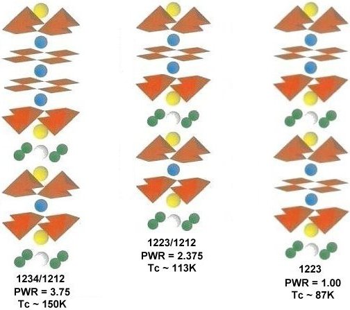 Below are the other 3 structure types from the Tc-vs-PWR plot. These members of the Sn-In-Ba-Tm-Cu family suggested the existence of an even higher Tc material between 160K and 190K.
