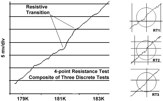 The composite graph at page top shows the sum of three separate resistance-vs-temperature (R-T) plots that were combined in order to improve the signal-to-noise ratio. Since the volume fraction of the 181K phase was less than 1% of the bulk, spotting the superconductivity signature proved difficult. By combining three separate tests, the S/N ratio improves by approximately 4 db. In the test apparatus a regulated 7 volts was applied across the primary of a 4-point probe. The resistive transition at Tc was then measured at around 7 millivolts across the secondary. Pb-doping has previously proven beneficial in other high-Tc copper oxides. Bi-2223, Hg-1223 and Tl-1223 all responded with an increase in Tc when the insulating layers were doped with Pb. Since Sn and Pb have the same oxidation states (+2, +4), Pb substitution was a logical choice for the 175K Sn-copper-oxide, as its use will not alter the hole state of the insulating layers. Below is a composite plot of three magnetization tests. The magnetometer uses twin Honeywell SS94A1F Hall-effect sensors with a tandem sensitivity of 50 mv/gauss. An unambiguous diamagnetic component appears between 183K and 184K. |