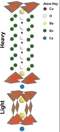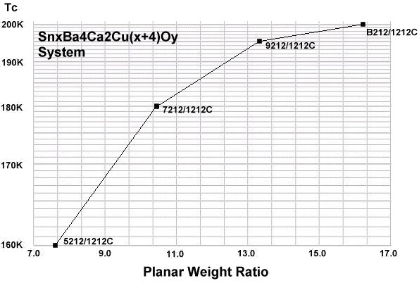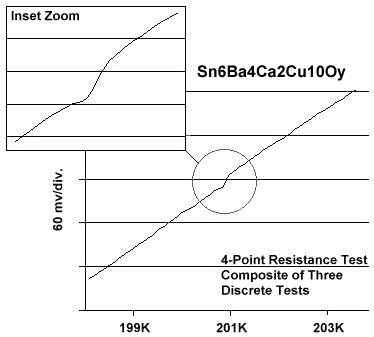 Analysis of the 160 K compound, dubbed Sn-3427, indicated that it could be an analog to the Sn-In-Pb-Tm copper-oxide family that produced Tc's up to 195 K. This became the impetus to add more Sn/Cu layers to increase the unit cell size and attempt to reach 200 K. However, instead of stacking 5 thulium atoms (heavy) opposite a single thulium atom (light), 6 tin atoms (heavy) would be stacked opposite a single copper chain (light). This attempt proved successful as a 200 K minority phase resulted.