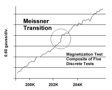 ![]() Above is a composite magnetization test, showing the Meissner transition occuring just above 202K. A flashing line has been added to illustrate the diamagnetic shift in slope below Tc. The quiescent noise is a result of zooming in on a small volume fraction. Four resistance tests were averaged and four magnetization tests were averaged, producing a mean resistive Tc of 200.8 Kelvin and a magnetic Tc of 202.4 Kelvin. |