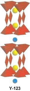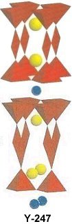 below left) and Y-247 (Tc~95K, below right). Y-123 has a colinear C axis, while Y-247 branches to accommodate an extra