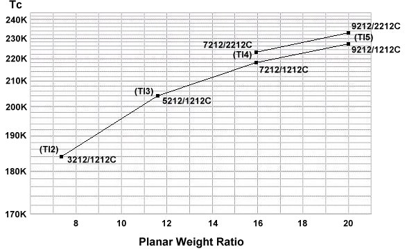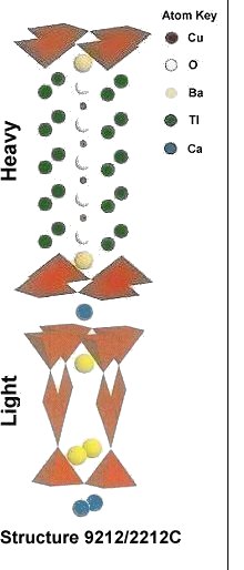 ![]() This very high Tc material, like previous record discoveries, was designed to exploit planar weight disparity (PWD) along the "c" axis of the 9212/2212C structure (shown at left). In this case a very heavy insulating layer in the upper part of the structure (Tl5Cu4) opposes a single copper chain in the lower part. Even though the copper chain branches, the planar weight ratio remains high - around 20:1. The structure that produced the previous 218K record material had a PWR just over 16:1. |