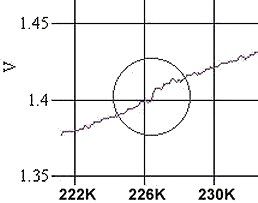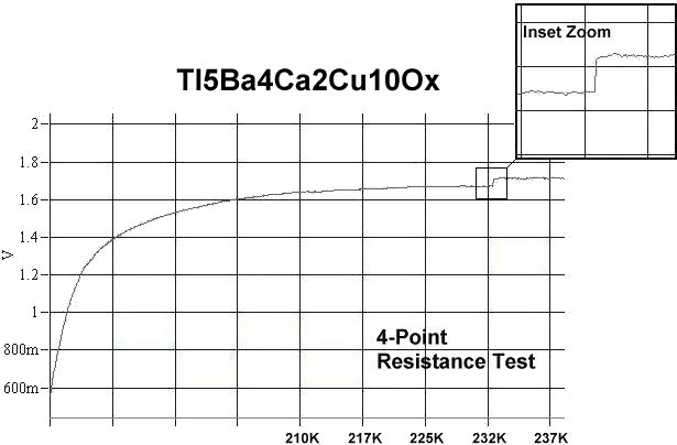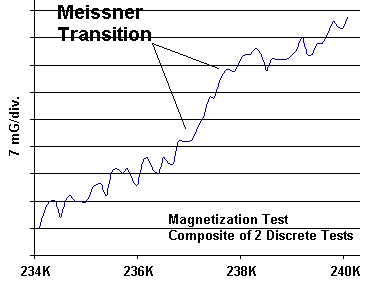 The host material producing the 233K signal has the chemical formula Tl5Ba4Ca2Cu10Oy. One of several resistance-v-temperature plots used to confirm this new record is shown above. And a composite magnetization test, showing the Meissner transition, is shown below right. A flashing line has been added to illustrate the diamagnetic shift in slope below Tc. The quiescent noise is a result of zooming in on a small volume fraction.