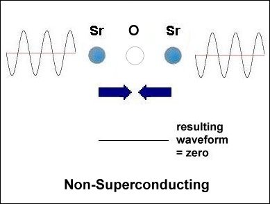 Having only 3 elements and a layered structure, the mechanism that makes superconductivity possible must be a simple one. It is already known that weight disparity must exist on opposite sides of the oxygen atoms. All known high-temperature superconductors can be shown to have it. Additionally, weight disparity is the only way to achieve periodic compression. Since the adjacent metals that facilitate superconductivity all have +2,+1 oxidation states, those states must be shifting back and forth in sync with the compression rate. This "virtual" redox does not involve the gain or loss of any elements. So very little energy is required to shift the ionic charge.[1] The below graphics illustrate the process by which superconductivity is achieved in this ternary system. In the below left box the sinusoidal waveforms near the Sr and Ca atoms show the relative frequency of each atom's vibration along the C axis. Since strontium is heavier than calcium, it oscillates at a lower frequency, producing fewer cycles per unit time. The result is that different vibrational frequencies heterodyne at the oxygen layer, producing periodic compression proportional to a complex waveform. However, in the SrO (non-superconducting) structure to the right, the waveforms cancel at the oxygen layer, due to identical frequencies producing a null heterodyne. Thus, a difference in atomic mass is essential to achieving periodic compression at the oxygen site.[2] |