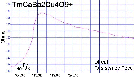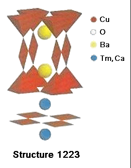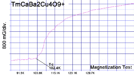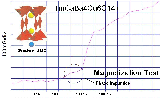 This new superconductor, TmCaBa2Cu4O9+, takes the YBCO structure and substitutes Thulium into the Yttrium atomic site. In 1987 Neumeier, et al, proved a Thulium-123 analog of YBCO could withstand an upper critical field (Hc2) of 1 Mega-Gauss.[1] This extrapolates to a magnetic field of roughly 36 Tesla at 77 K. But the Neumeier analog also showed a Tc drop to 90 Kelvin — 2 degrees lower than YBCO. So the next order of business was to increase Tc. This has now been achieved by applying planar weight disparity across the apical oxygen ions. Looking at the 1223 structure at left, Calcium has been placed collinearly in the C2 axis so that there are now 3 heavy atoms (2 Barium and 1 Thulium) in line with a light Calcium atom. This gives a planar weight ratio of over 11-to-1. With this arrangement Tc is increased from 90K to around 102K (see plots at page top). Use of Calcium also has the added benefit of increasing the critical current density up to 35% across grain boundaries, as was confirmed in bulk Y-123 by Brookhaven National Laboratory researchers in 2005.[2] The TmCaBa2Cu4O9+ result, including an extra copper plane, is a unit cell that is just slightly larger, but performs significantly better than pristine YBCO. And tests suggest its volume fraction is comparable to YBCO. The only minority phases observed were near 147K and 167K — well above the majority phase Tc of 102K.