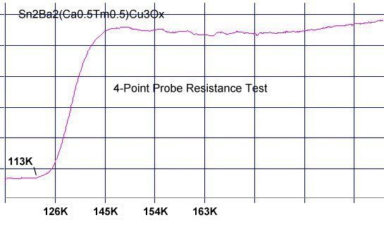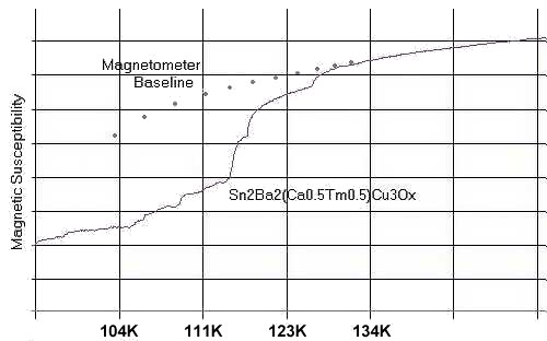 Incorporating tin into the copper-oxides is often difficult due to tin's small ionic radius. And, thulium ceramics are usually ferrites. Thus, successfully bringing both tin and thulium into the mix, makes this a very unusual material. Tm2+ is typically magnetic, with an unpaired and strongly magnetic f electron. Tm3+ is f12 and is also magnetic. However, if anything, these qualities seem to buttress the higher Hc that Tm-123, for example, has over Y-123.(2) Additional tests are planned to better characterize this new compound.