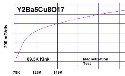 The magnetization curve of Y258 is also unusual. In most conventional superconductors, a diamagnetic component suddenly appears near the resistive Tc. In this discovery there is a gradual decrease in magnetism and a small kink in the curve near 89.5 Kelvin. That temperature is significant in that it's also the magnetic Tc of Y358 and its calcium-doped analog Y2CaBa4Cu7O16+. Those two superconductors were also enhanced versions of YBCO whose Tc improvements were resistive only. Thus, this kink may represent a Y358 minority phase. Click HERE to read more about this odd behavior.