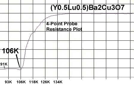 Some rare earths - like Ce and Tb - prefer a tetravalent site. Others like Yb require more Cu, which alters the 1212C structure. Additionally, the tetragonal 1-2-3 structures are usually semiconducting. So, constraints are put on what combinations can be attempted. Among the heavy rare earths that are compatible and produce an orthorhombic lattice, an exact 50-50 mix of Yttrium and Lutetium produced the best results - a Tc of 106K (see below). Lutetium is the heaviest of the rare earths.