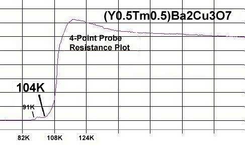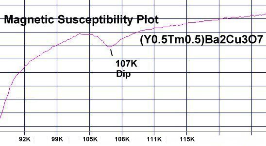 Seemingly, the greater the weight ratio of Re-to-Y, the greater the improvement. In the above plot a 15K Tc improvement is seen with a mix of Lutetium and Yttrium. In the below plot of (lighter) Thulium and Yttrium, the improvement is only 13 degrees - but the transition is sharper. A small amount of (normal) YBCO that formed as a minority phase can be seen near 91K in both plots.