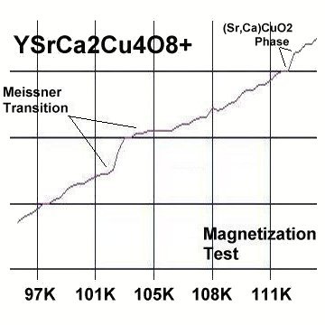 A crude magnetization test (shown above) was performed on the 101K material using twin Hall-effect sensors. Surprisingly, a second Meissner transition appears near 112K. This phase may be the known superconductor (Sr,Ca)CuO2, with Tc~110K.