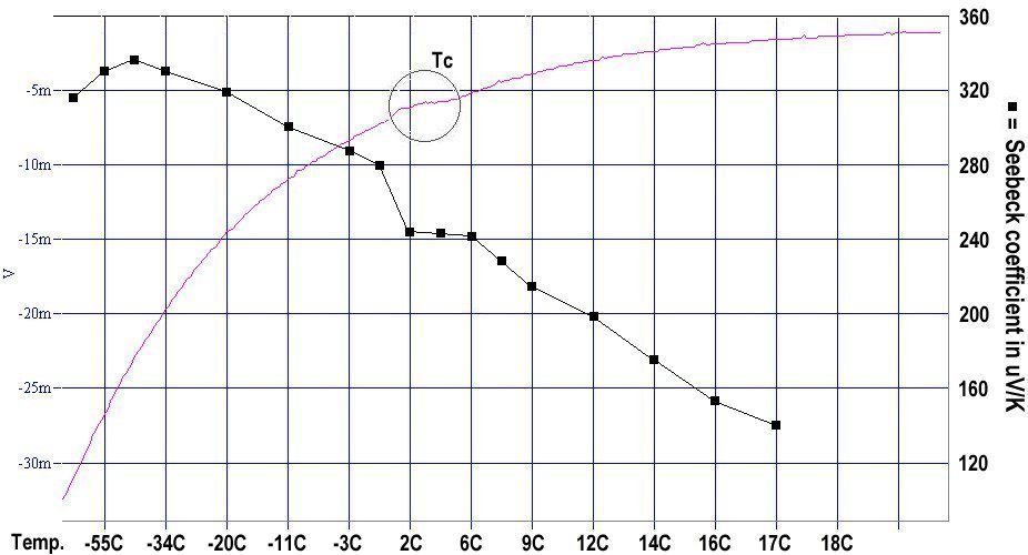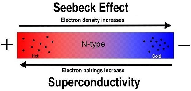 In an N-type thermoelectric material electrons are the dominant charge carriers. These electrons rush from the hot side to the cold side of the material when a temperature gradient exists. That migration produces a voltage potential (EMF - electromotive force) between the hot and cold ends. Electrons are also the charge carriers in a superconductor. They couple together in a mechanism known as Cooper-pairing in order to overcome the scattering action of lattice vibrations. If a thermoelectric material were 100% superconductive, no voltage would appear below its critical transition temperature (Tc). Zero internal resistance would prevent this. However, if there is just a small amount of superconductive material within a thermoelectric bulk, things get interesting.