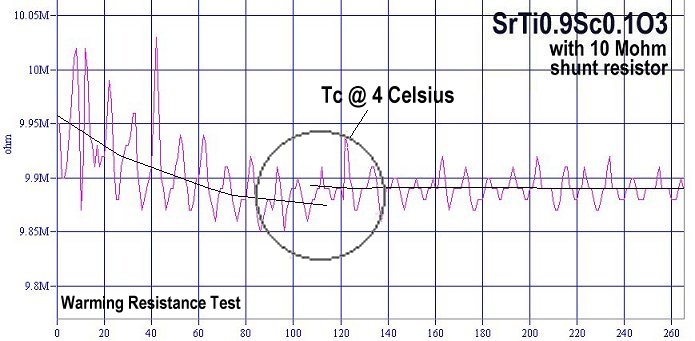 The below plot shows a direct resistance test, with a resistance drop appearing below 4 Celsius. Lines representing average resistance skew apart about 20 kilohms within the area circled. The jitter in the plot is most likely caused by the scandium doping.