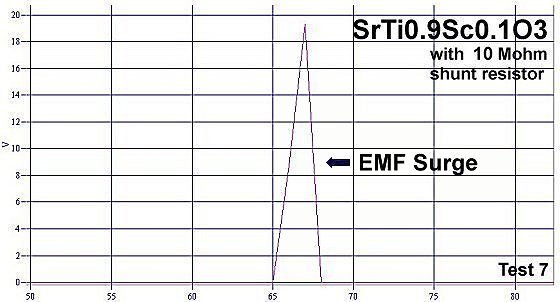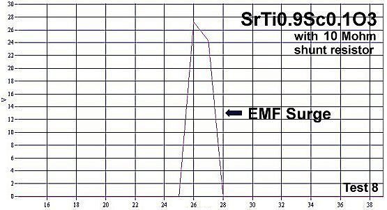 AUGUST 14, 2017, UPDATE: At first it was thought this phenomenon only occurred with N-type thermoelectric materials. However, a P-type material with formula SrTi0.9Sc0.1O3 has been found to also generate a colossal EMF surge when rapidly cooled at one end to -55 C. And its voltage surges are even stronger than the prototype - approaching 30 volts at times (shown below). This material also contains a low-volume-fraction superconductive phase. Resistance tests indicate a Tc near 4 Celsius. In these tests a 10 megohm shunt resistor was included to stabilize the digital voltmeter, due to a very high source resistance. The prototype had a high resistance as well, but did not require a shunt resistor.