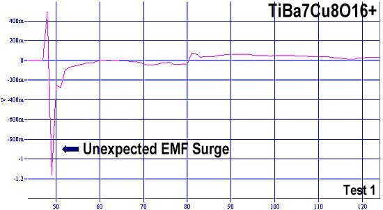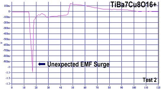 In the plots at page top, a colossal voltage surge appears as the thermoelectric compound TiBa7Cu8O16+ is rapidly cooled at one end to -50 Celsius. This material contains a low-volume-fraction (VF) superconductor with a critical transition temperature (Tc) near 0 C. An EMF potential of around 1.1 to 1.2 volts appears consistently in repeated tests. In the below plot, slow warming tests of the same material showed a Seebeck coefficient of around 330 uV/K at -50C. This means a temperature differential of more than 3,300 degrees Kelvin should be required to produce a surge of 1.1 volts. Clearly something extraordinary is going on.