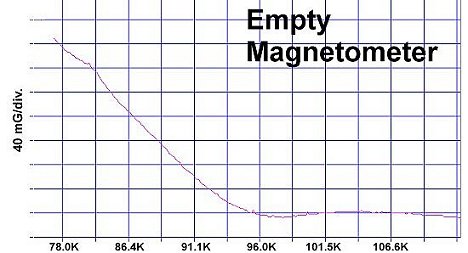 Reentrant superconductivity (shown below) is a well-known phenomenon where, at a discordant temperature, superconductivity briefly disappears due to magnetic ordering state conflicts. However, in this new material, just the opposite occurs. It is the superconductive state that only briefly appears. ![]() Prof. Robert J. Cava, head of the Princeton University Superconductivity Lab, observed that the change [in the plot at top] appears "too continuous with temperature to represent two separate phase transitions at different temperatures (superconductivity and magnetism)." In the below magnetization test, there is no clear diamagnetic signature at the point where resistance drops to zero. Only a small shelf is evident. However, other novel materials also fail to display accompanying diamagnetism at the resistive Tc. The ruthenates, for example, do not. A plot of an empty magnetometer is also shown to explain the negative slope below 96 Kelvin. |
